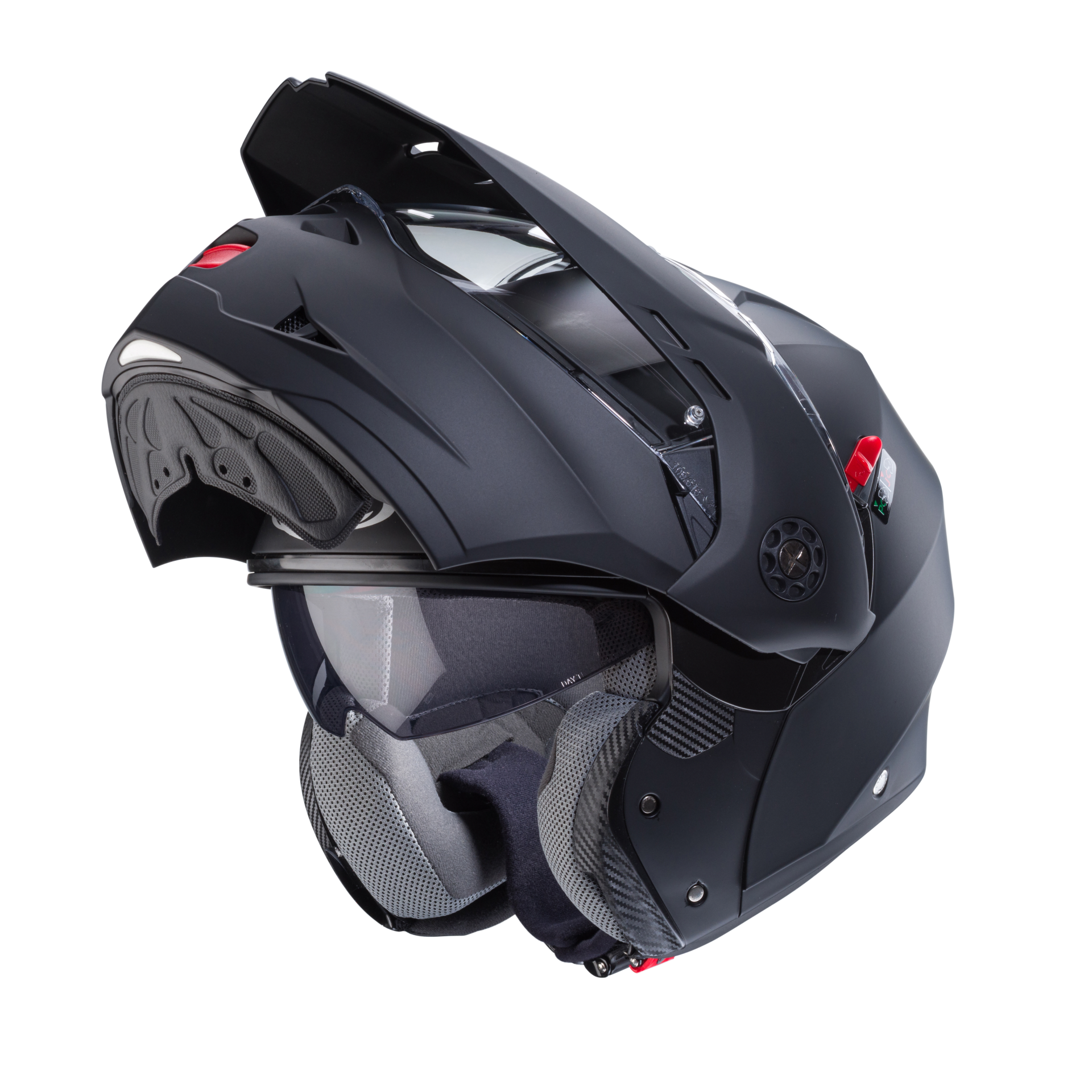 TOURMAX X, P/J çift homologasyona sahiptir, bu da çene koruyucusu açıkken sürüş yapmanıza olanak tanır ve sol tarafta bulunan P/J kolu sayesinde güvenliği garanti eder. Bu kol, "J" konumunda olduğunda, çene koruyucusunu tamamen açık tutar ve kazara kapanmasını engeller. Kutu içinde, TOURMAX X'i, zirve olmadan geleneksel flip-up modeline dönüştürmek için vidalar bulunur.