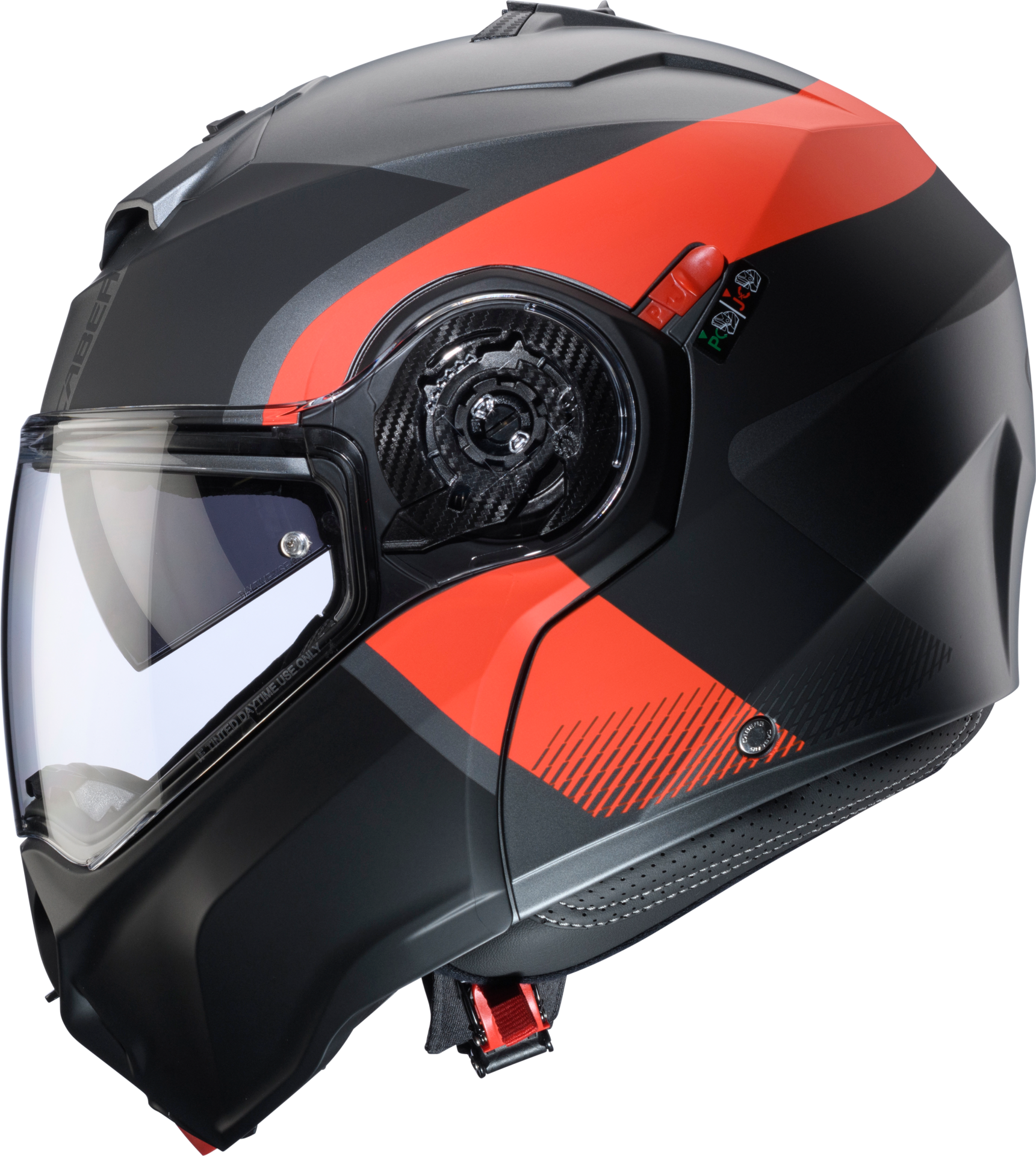- DUKE EVO, ECE 22.06 çift homologasyon “P/J” sertifikasına sahiptir. Bu sayede, çene koruması açıkken de güvenle kullanılabilir. Kaskın sol tarafındaki P/J kolu, çene korumasını açık pozisyonda sabitler.