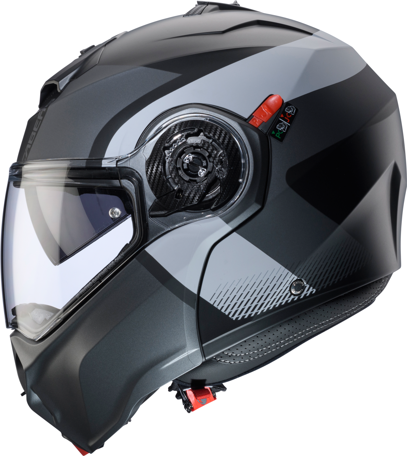 - DUKE EVO, ECE 22.06 çift homologasyon “P/J” sertifikasına sahiptir. Bu sayede, çene koruması açıkken de güvenle kullanılabilir. Kaskın sol tarafındaki P/J kolu, çene korumasını açık pozisyonda sabitler.