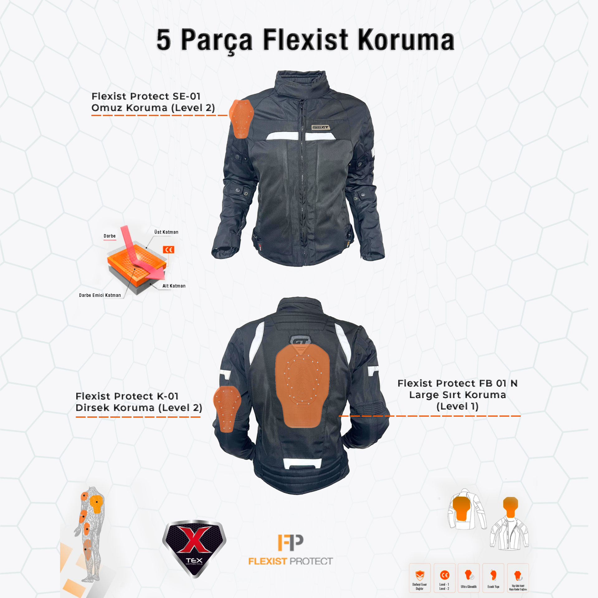 CE Onaylı Kadın Tipi Korumalar: Omuz ve dirseklerdeki CE sertifikalı korumalar, kadın vücut yapısına uygun yerleşimleriyle konforu ve güvenliği bir arada sunar.