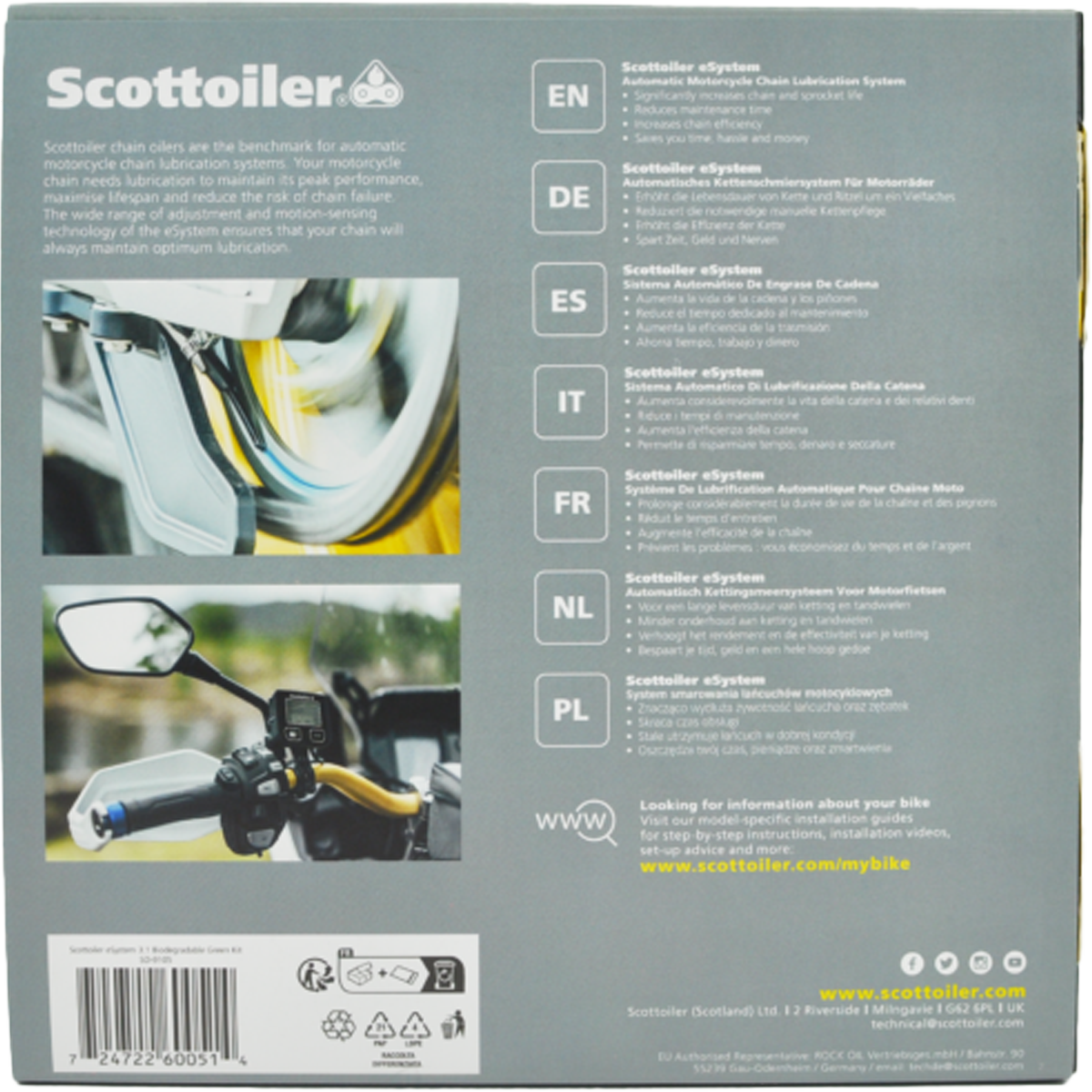 Montaj sonrasında eSystem 3.1, yağı zincire yüksek hassasiyetle iletir – zincirin temiz ve yağlı kalmasını sağlar. Depo yaklaşık 1.500 mil (yaklaşık 2.400 km) boyunca yeterli yağ sağlar. Bir Scottoiler sistemi kullanmak, zincir ömrünü 7 kata kadar uzatabilir, sık manuel bakım ihtiyacını ve zincir-dişli değişim maliyetlerini azaltır.Kutu İçeriği
