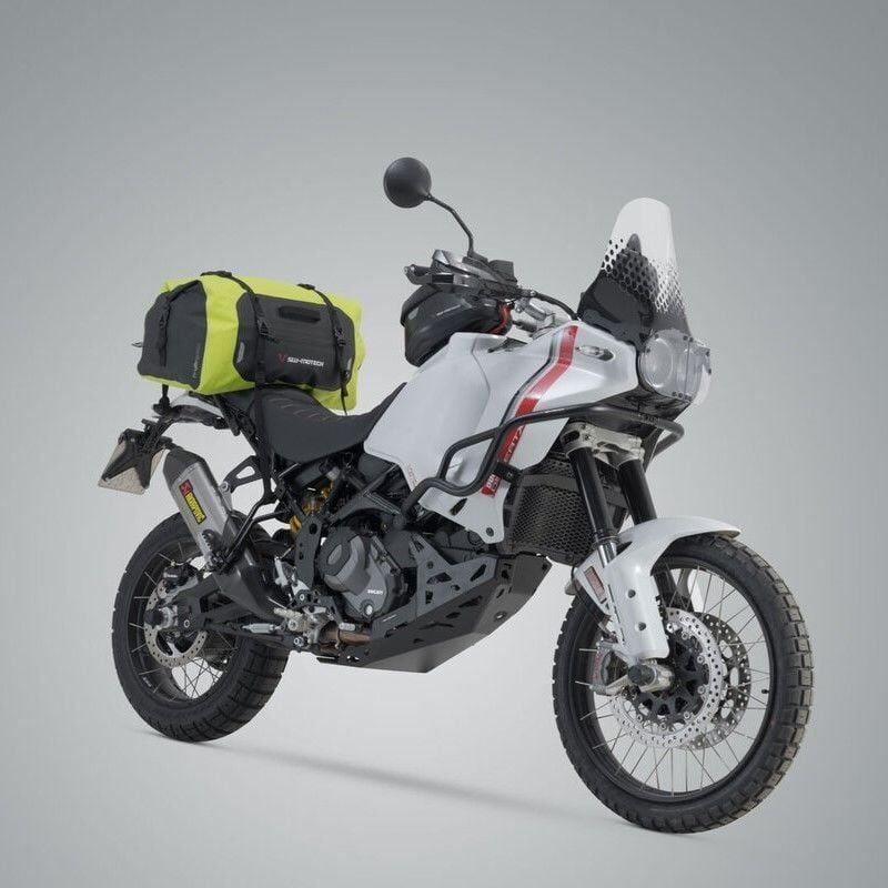 Drybag 350, motosikletinize sadece birkaç basit adımda monte edilebilir ve seyahat eşyalarınız için bolca alan sunar. Gri ve sarı renk seçenekleriyle sunulan bu kuyruk çantası, Drybag serisindeki hem daha büyük hem de daha küçük modellerle kolayca kombine edilebilir. Yan taraftaki fermuarlı cep kişisel eşyalarınıza hızlı erişim sağlar ve pratik taşıma sapı, çantayı elde taşımayı kolaylaştırır.