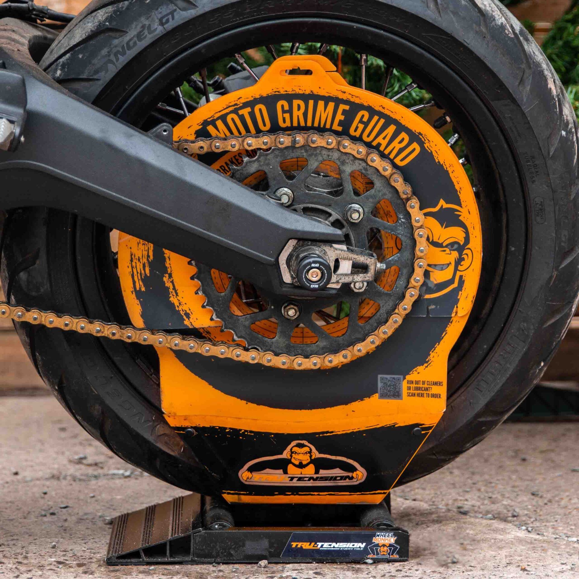 Moto Grime Guard, fren diskleri, kaliperler, fren balataları ve lastikler gibi önemli fren yüzeylerini temizlik sırasında kirlenmekten korur. Kullanışlı tepsisi, zincir ve dişlileri temizlerken ortaya çıkan tüm yağlı akıntıyı toplar ve garaj zemini ile giriş yollarında leke oluşumunu engeller.